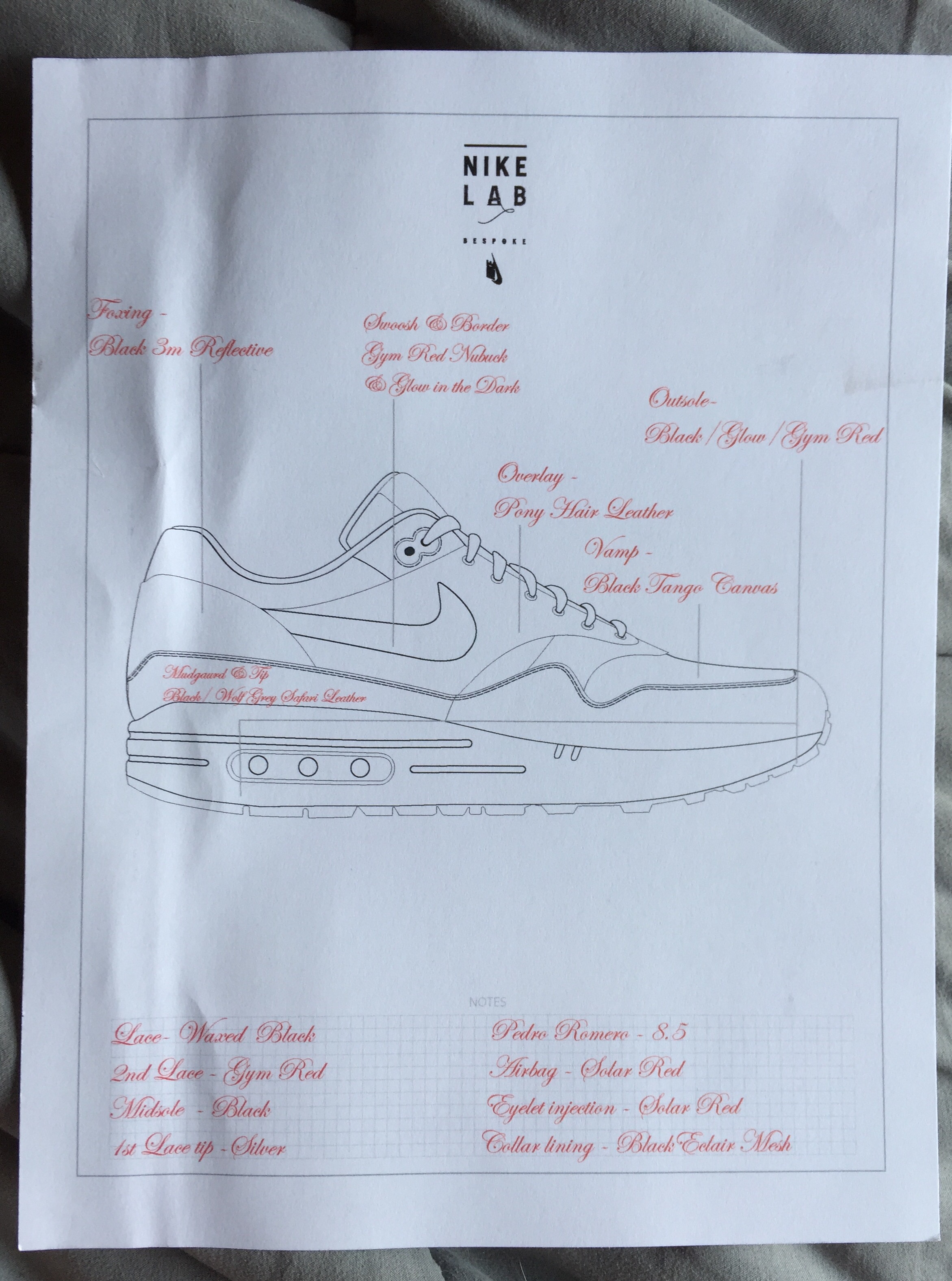 Después de una hora de estar dando vueltas por toda la sala, agregando, quitando materiales, combinándolos, poniendo detalles que dieran fuerza a mi sello personal dentro del par, ellos me mostraron un preview de como se vería mi par, sin duda sabía que había hecho un trabajo excelente, estaba satisfecho en todo, ahora quedaba esperar 10 largas semanas para conocer mi creación.