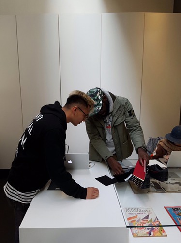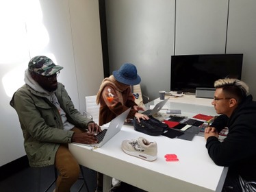 Entonces comenzó todo; después de la explicación nuestro anfitrión nos muestra 3 repisas blancas con cajones y dentro de ellas se encontraban una cantidad inimaginable de materiales para poner en el par, desde materiales sintéticos como mesh, canvas, gamuza, hasta pieles neutras, pieles exóticas, telas con prints espectaculares como «liberty»; había de todos los colores, todos los materiales, así que comencé tomando uno de mis materiales favoritos, el «Safari print», así hasta que reuní 20-25 materiales. Quería que todos estuvieran ahí, sin embargo sabía que sería un reto (por lo que les comente acerca del uso de los materiales).