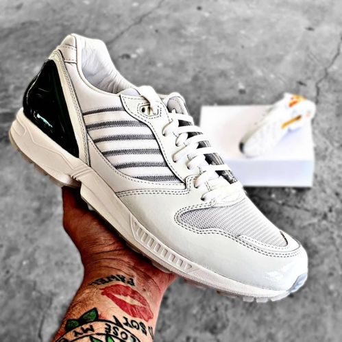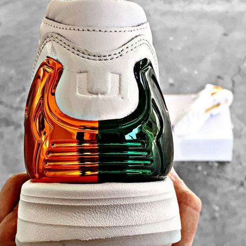 A mi me encantan los tenis de color blanco, pero no que sean totalmente blancos. Este par es parte de la serie «A-ZX» trae detalles increíbles, como la parte del talón cromada con los colores de la Universidad de Miami formando su clásico logo con la la letra «U», en la parte de la suela también trae el logo y pues no me podía quedar sin alguno de los lanzamientos que para mi fue la colección del año.